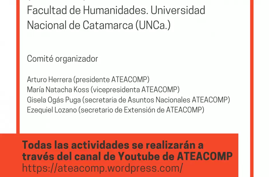 Ayer dio inicio el X Congreso Nacional e Internacional de la Asociación Argentina de Teatro Comparado (ATEACOMP), con sede en Catamarca, de carácter virtual y organizado por la ATEACOMP en conjunto con la Universidad Nacional de Catamarca (UNCA) a través de su Facultad de Humanidades.