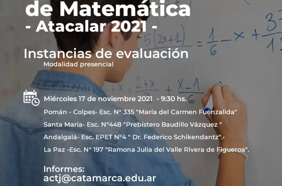 El Ministerio de Educación y la Coordinación de Actividades Científicas y Tecnológicas Juveniles (ACTJ) dependiente de la Secretaría de Gestión Educativa informan a la comunidad educativa que las instancias de evaluación de las “Olimpiadas de Matemática de Catamarca - Atacalar 2021” se realizarán de manera presencial, de acuerdo al siguiente cronograma.
