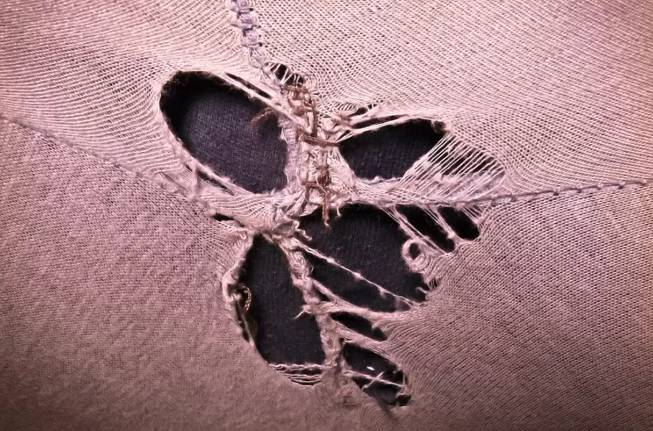 - En primer lugar voltea la prenda de ropa. Revisa bien el agujero, si la tela está muy rasgada lo ideal es colocar un borde de tela fliselina para que no se deshilache la prenda luego de arreglarla.