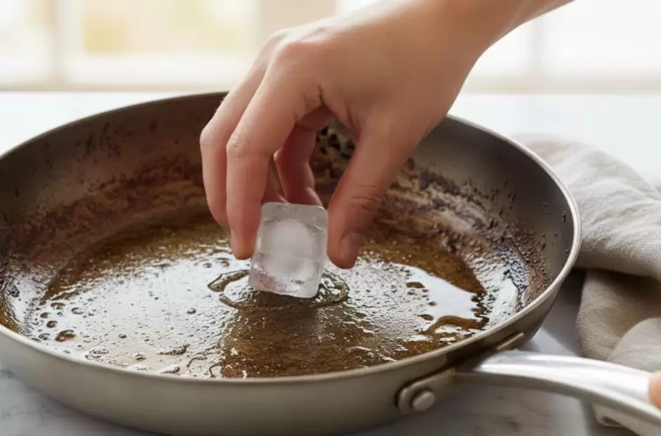 • Para manchas rebeldes, sumá un poco de sal gruesa junto con el hielo: la textura ayuda a despegar la grasa sin dañar la sartén.