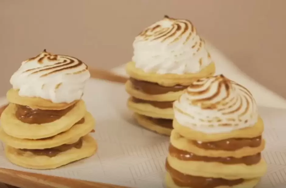 6- Una vez frías, armar los rogelitos untando cada tapa con dulce de leche. Decorar con el merengue formando picos y dorar con un soplete.