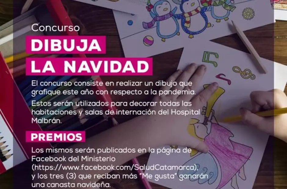Quienes deseen participar deben entregar su dibujo en la oficina de Prensa del Ministerio de Salud, en calle Chacabuco Nº169, de lunes a viernes en el horario de 08 a 12 horas. Los mismos serán publicados en la página de Facebook del Ministerio (https://www.facebook.com/SaludCatamarca), y los tres (3) que reciban más “Me gusta” ganarán una canasta navideña.