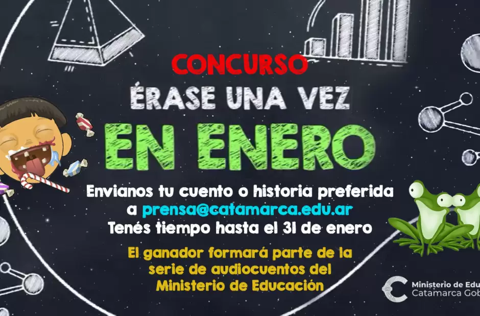 El Ministerio de Educación invita a niños, jóvenes y adultos a participar del concurso “Érase una vez en enero”, el cual consiste en que los participantes envíen su cuento preferido, el de su niñez, el que marcó su infancia, cuentos típicos locales o narraciones tradicionales de Catamarca. El relato ganador será grabado a través de un audiocuento y publicado en las plataformas digitales que posee el Ministerio de Educación de la provincia.