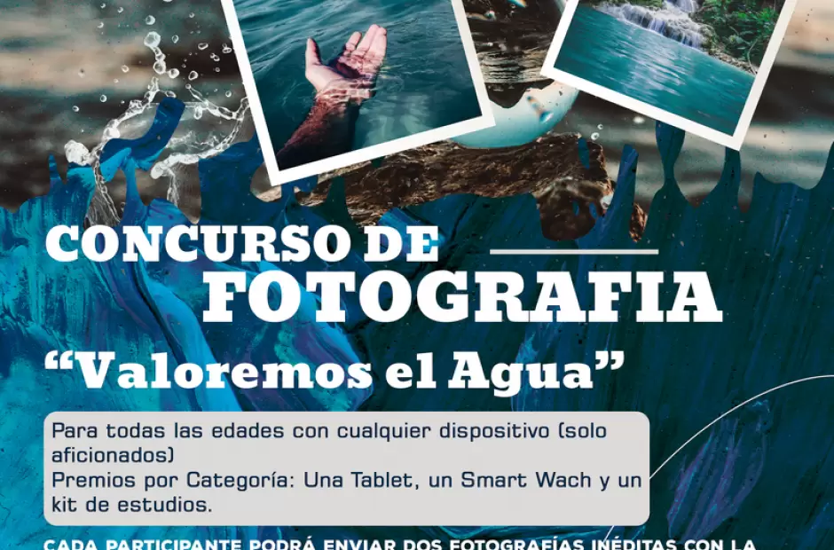 Los participantes pueden presentar todas las fotografías que representen el valor del agua y tomadas con cualquier tipo de dispositivo fotográfico, cámara, teléfono inteligente, tableta o dron. Es importante destacar que no se permitirá fotógrafos profesionales.