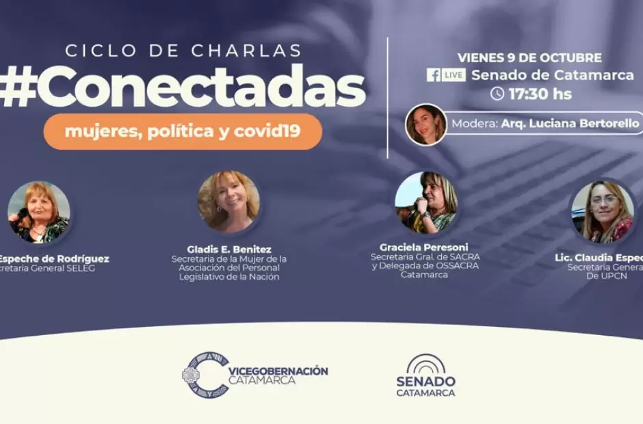 En horario especial, este viernes a las 17.30, a través de la página de Facebook del Senado de Catamarca, una nueva charla del ciclo #Conectadas (mujeres, política y COVID-19), organizado por Vicegobernación de la Provincia con el objeto de generar intercambio y escucha con mujeres de los más diversos ámbitos, tendrá a referentes de asociaciones de trabajadores.