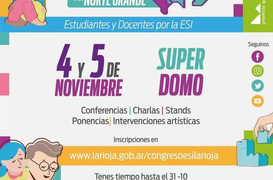 El Ministerio de Educación a cargo de Andrea Centurión a través del programa ESI dependiente de la Dirección de Programas Educativos invita a docentes y alumnos a participar del Congreso “ESI del Norte Grande” que se desarrollará los días 4 y 5 de noviembre en la provincia de La Rioja, de manera bimodal y que contará con la participación de las provincias de la Rioja, Tucumán, Catamarca, Salta, Jujuy, Santiago del Estero, Chaco, Formosa, Corrientes y Misiones.