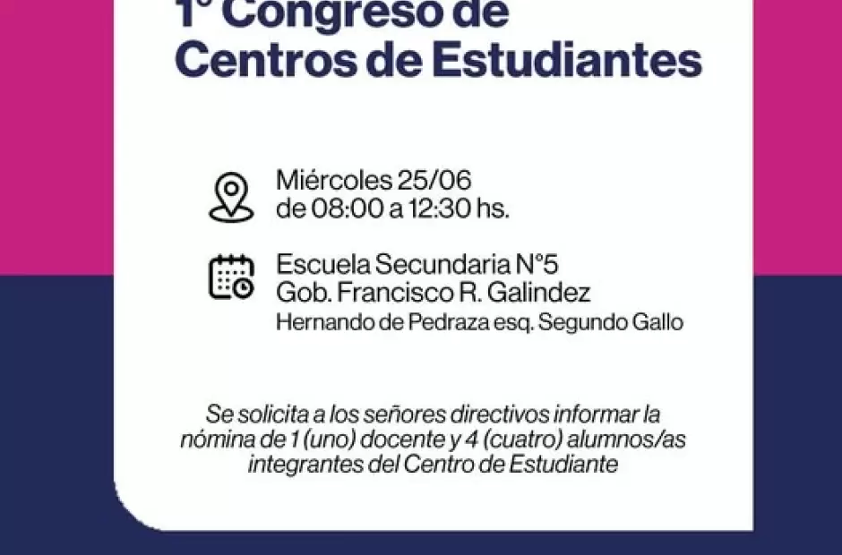 El evento se llevará a cabo el miércoles 25 de junio a las 8:00 horas en la Escuela Secundaria N°5 "Gobernador Francisco Galíndez", ubicada frente a OSEP, en la ciudad Capital.