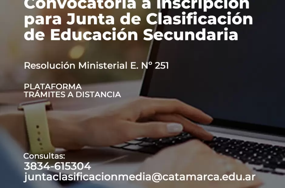 Cabe destacar que el Ministerio de Educación de la Provincia a cargo de la Dra. Andrea Centurión autorizó mediante Resolución E. Nº 251 “implementar la Inscripción en Junta de Clasificación de Educación Media, Técnica y Artística para Interinatos y Suplencias, a través de un nuevo sistema de inscripción virtual: TAD -Trámites a Distancia-, que se llevará a cabo a través de la plataforma digital del Ministerio de Modernización de la Provincia de Catamarca, a partir del presente año y mientras la Provincia de Catamarca se encuentre ensituación de alarma epidemiológica y sanitaria”.