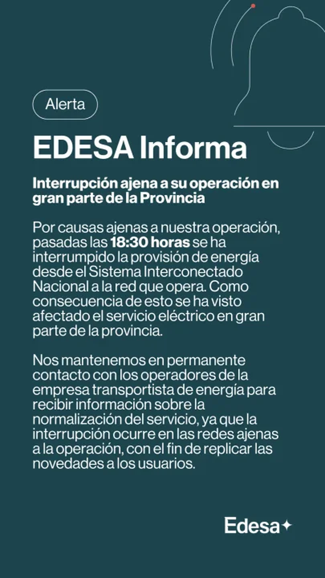 "Pasadas las 18:30 horas se interrumpió la provisión de energía desde el SIN a la red que opera EDESA", señalaron en un comunicado.