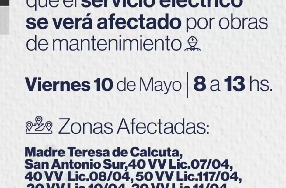La empresa de Energía Catamarca Sapem programa para este viernes 10 de mayo un corte en el servicio eléctrico, esto por obras de mantenimiento el que afectará a barrios de la Capital. La restricción va a ser de 8 a 13 hs.