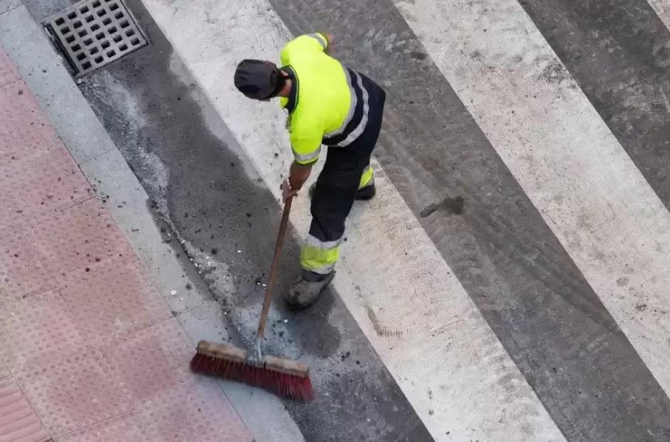 Un peón general de barrido y limpieza es el encargado de mantener la higiene completa de los espacios públicos, retirando la basura o el agua que queda acumulada en algunos sectores.