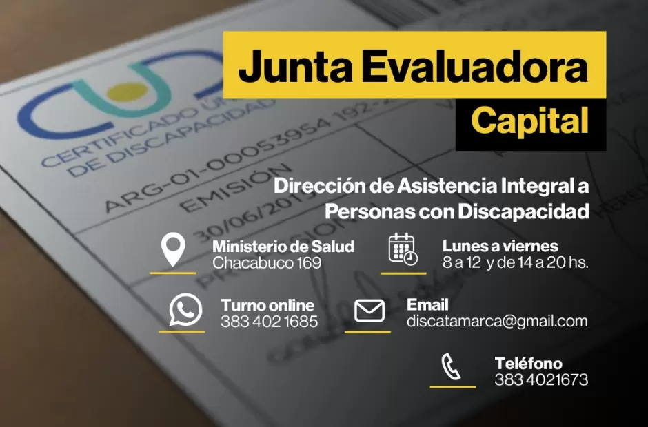 La Junta Evaluadora de Capital (que funcionaba en Av. Perón esquina Av. Illia), comenzará a atender en su nuevo domicilio, de lunes a viernes, de 8 a 12 y de 14 a 20 horas. Para consultas 3834 021685 (WhatsApp), 383 4021673 (llamadas), de lunes a viernes de 8 a 12 horas, o por correo electrónico [email protected].
