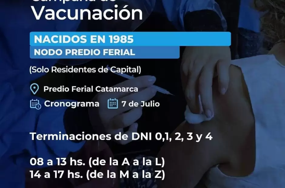 Continuando con el Plan Operativo de Vacunación Covid-19, el Ministerio de Salud de la provincia informa que desde el día miércoles 7 al sábado 10 de julio se aplicarán primeras dosis a las personas nacidas en 1984, 1985 y 1986 (con y sin factores de riesgo asociados a Covid), residentes de Capital.