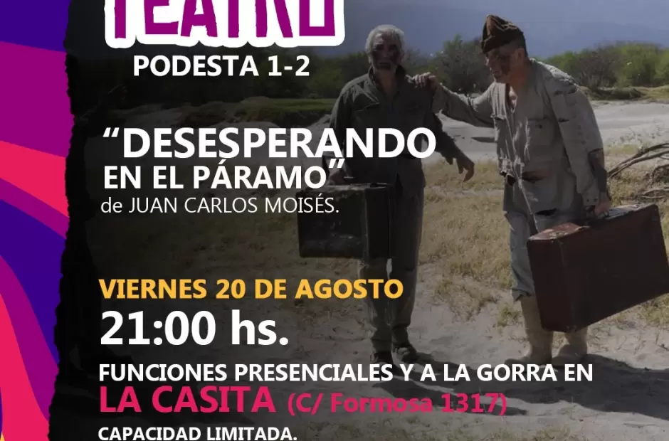 El viernes 20 de agosto a las 21 horas se presenta “Desesperando en el Páramo”, obra de Juan Carlos Moisés, en La Casita ubicada en la calle Formosa 1317, continuando la programación de este ciclo prevista para el mes de agosto.