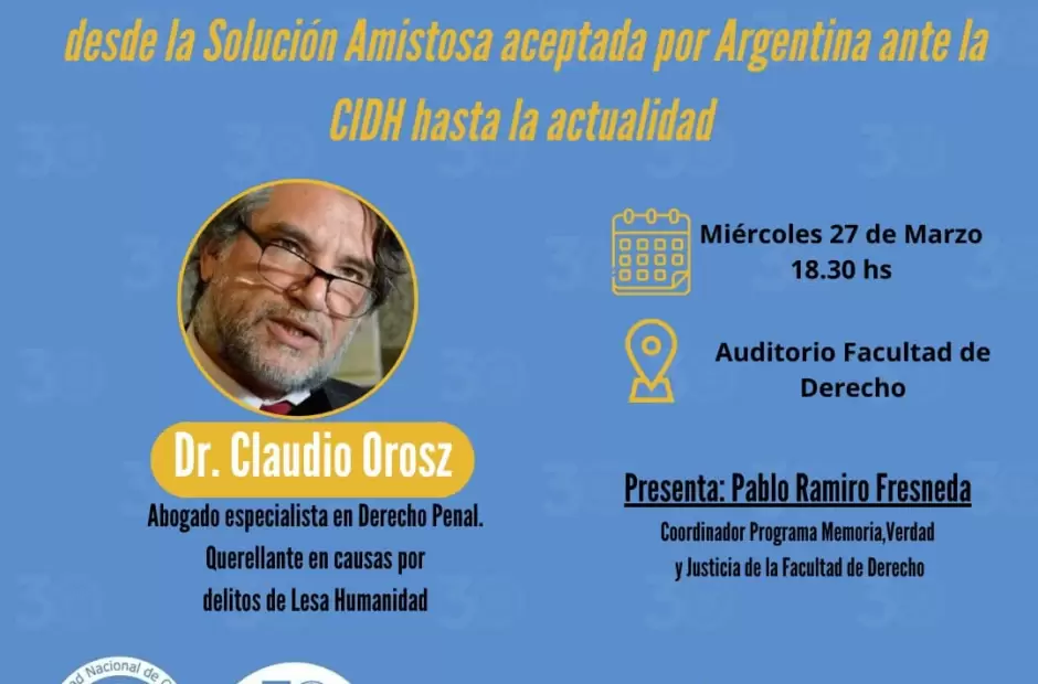 En el marco de las actividades previstas por los 30 años de la Reforma Constitucional de 1994 y en conmemoración al Día Nacional de la Memoria por la Verdad y la Justicia, la Facultad de Derecho junto al Colegio de Abogados, organizan para este miércoles 27 de marzo una Conferencia sobre "Crímenes de Lesa Humanidad desde la solución amistosa aceptada por Argentina ante la CIDH hasta la actualidad", a cargo del destacado jurista Dr. Claudio Orosz. El encuentro se llevará a cabo en ámbitos del auditorio de la Unidad Académica, a las 18.30 horas.