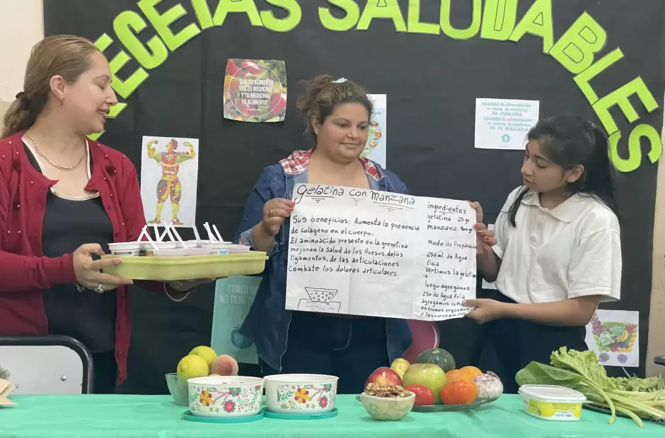 Para dar inicio a las actividades, docentes de la institución expusieron sobre temas como la Ley de Etiquetado Frontal y la importancia de una alimentación saludable en la escuela, así como también, la elaboración de recetas y preparaciones saludables creadas por los estudiantes y sus familias. A su vez, otro grupo de profesores y alumnos, visibilizaron el armado de su huerta vertical para dar inicio a la producción sostenible y ecológica de alimentos.