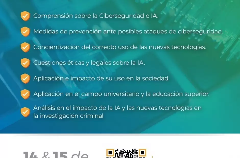 Estos serán algunos de los temas y expositores: Usos de la inteligencia artificial en ciberseguridad: mitos y realidades, por el Mgter. Gustavo Sain; Investigación criminal y nuevas tecnologías, por la Mgter. Daniela Dupuy; Importancia de la Ciberseguridad e inteligencia artificial en las organizaciones Seguridad en los centros de datos, a cargo del Mgter. Diego Emanuel Peralta; Ciberseguridad en tiempos de la Inteligencia Artificial, del Mgter. Néstor Valdez; Potencialidad extraordinaria y riesgos extremos de la inteligencia artificial, por la Mgter. Marcelo Sosa.