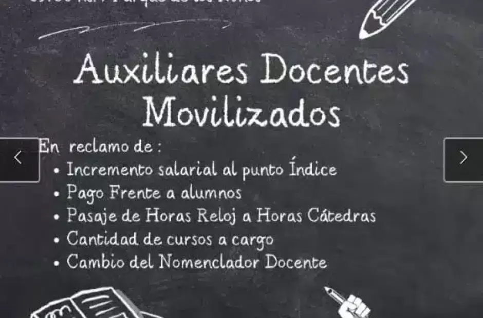 Luego de las dos marchas de los Docentes Autoconvocados, ahora los Docentes auxiliares se suman a la protesta. La nueva agrupación está convocando a una marcha para este miércoles. La cita va a ser a las 9 hs en el Parque de Los Niños. A esta se van a sumar los Autoconvocados para de esta manera seguir presionando por una convocatoria oficial