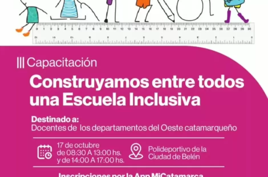 El Ministerio de Educación, Ciencia y Tecnología de Catamarca, en articulación con la Municipalidad de la Ciudad de Belén, anunció la realización de la III Capacitación "Construyamos entre todos una Escuela Inclusiva", una propuesta de formación que convoca a docentes de los departamentos del Oeste catamarqueño. La jornada tendrá lugar el jueves 17 de octubre, en el Polideportivo de Belén, y se desarrollará en doble turno: de 8:30 a 13:00 y de 14:00 a 17:00 horas.