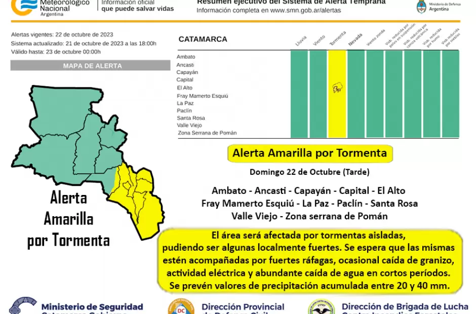 El Servicio Meteorológico Nacional, emitió nueva Alerta Amarilla por tormentas, la que está vigente para la tarde deste domingo. La misma afectará los departamentos: Ambato, Ancasti, Capayán, Capital, El Alto, Fray Mamerto Esquiú, La Paz, Paclín, Santa Rosa, Valle Viejo y la zona serrana de Pomán