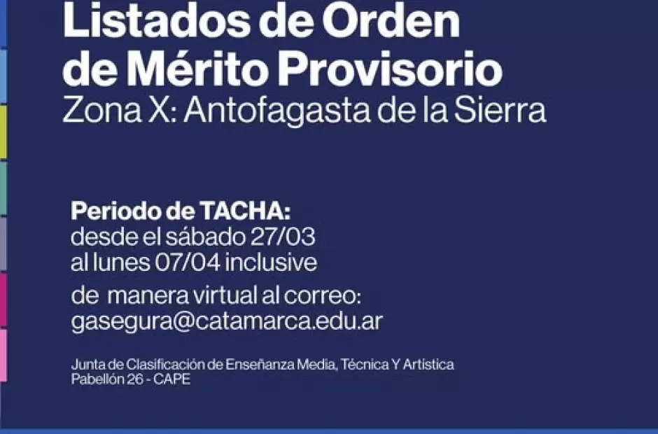 A través de la Junta de Clasificación de Enseñanza Media, Técnica y Artística, la cartera educativa informó a los docentes de Nivel Secundario inscriptos para el periodo 2025-Antofagasta de la Sierra- que se encuentra publicado el Listado de Orden de Mérito provisorio en www.catamarca.edu.ar