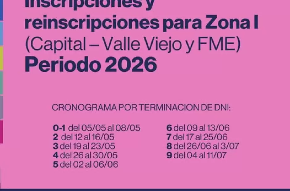Mediante la Junta de Clasificación de Enseñanza Media, Técnica y Artística, el Ministerio de Educación informó a los docentes de nivel secundario que las inscripciones y reinscripciones para zona I (Capital-Valle Viejo-Fray Mamerto Esquiú) periodo 2026, se llevarán a cabo desde este lunes y hasta el de 11 de julio de 2025 inclusive, por terminación de DNI con modalidad presencial.
