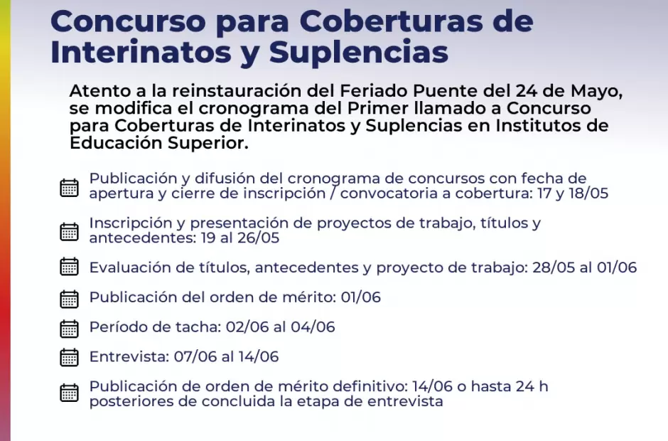 El Ministerio de Educación, la Secretaría de Gestión Educativa y la Dirección de Educación Superior informan que “atento a la reinstauración del Feriado Puente del 24 de Mayo, se modifica el cronograma del Primer llamado a Concurso para Coberturas de Interinatos y Suplencias en Institutos de Educación Superior”.