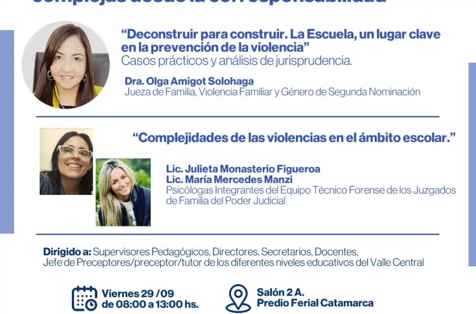 Dicho evento contará con la disertación “Deconstruir para construir. La Escuela, un lugar clave en la prevención de la violencia”, con casos prácticos y análisis de jurisprudencia a cargo de la Dra. Olga Amigot Solohaga, Jueza de Familia, Violencia Familiar y Género de Segunda Nominación. Además, se trabajará sobre las “Complejidades de las violencias en el ámbito escolar” con la Lic. Julieta Monasterio Figueroa y la Lic. María Mercedes Manzi, Psicólogas integrantes del equipo técnico forense de los Juzgados de Familia del Poder Judicial.