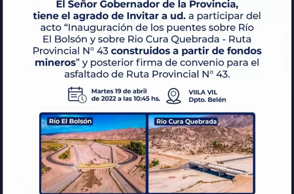 El Gobernador Raúl Jalil realizará un acto para la inauguración de los puentes sobre el Río Bolsón y el Río Cura Quebrada, ubicados sobre la Ruta Provincial N° 43 en Villa Vil, Belén. El evento tendrá lugar este martes 19 de abril a las 10:45 horas.