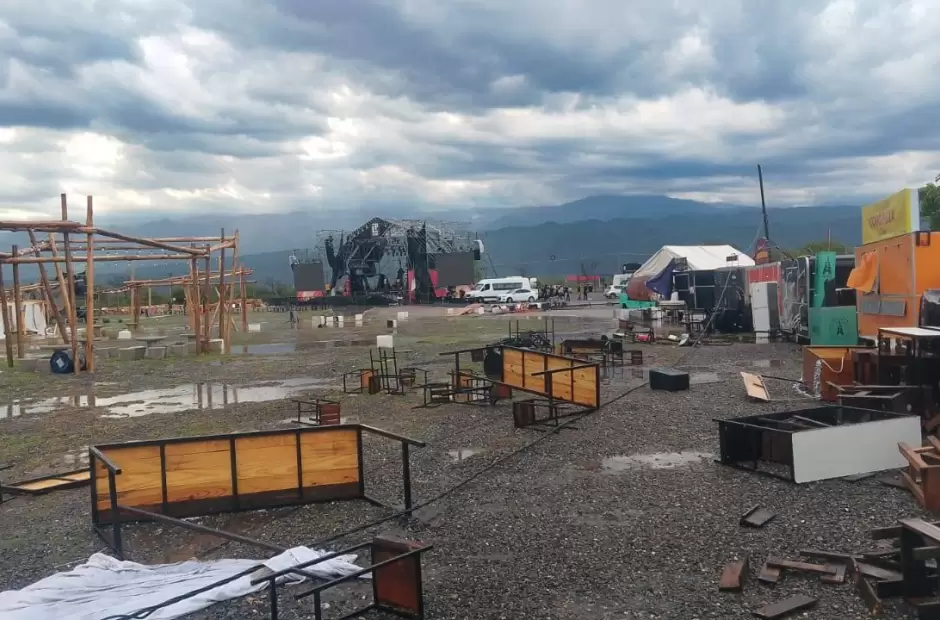 El temporal impactó con particular fuerza en la zona del Predio Ferial, donde se desarrollaba el evento. Las intensas ráfagas de viento y la abundante caída de agua provocaron la destrucción de gran parte de los puestos, el desplome de carpas y severos daños en las estructuras montadas especialmente para la feria. Entre los sectores afectados se encuentra el escenario principal "El Patio", que, a pesar de su imponente estructura de casi 35 toneladas, no resistió el embate del viento.