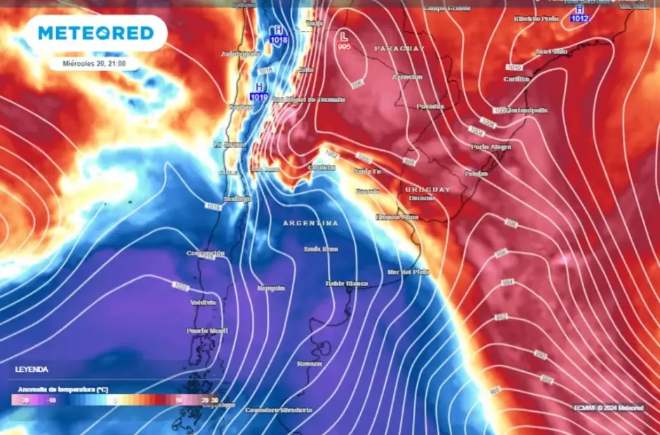 Será el miércoles una situación en donde podrían darse tormentas fuertes en la zona central de la Argentina, conforme al intenso contraste de masas de aire que interactuarán. Hacia la segunda mitad del miércoles se hará efectivo el ingreso de frío polar, comenzando un derrumbe muy marcado de las temperaturas, y fuertes vientos del sur.