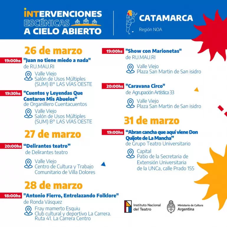 Desde el 26 al 28 de marzo, el teatro retoma la actividad ahora en Valle Viejo por la cooperación y la coordinación entre diferentes espacios y salas culturales, organismos estatales, comunidad artística, intendencias y la representación en Catamarca del Instituto Nacional de Teatro (INT).