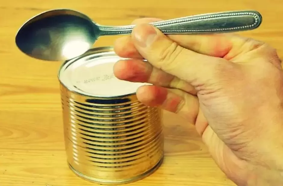 - Para empezar, hay que tomar la cuchara y apoyar la punta en el borde interior de la lata. Luego hay que frotar el "filo" de la cuchara en el borde del aluminio haciendo presión hacia abajo y con movimientos rápidos. Luego de unos segundos notaremos que el metal empieza a ceder.