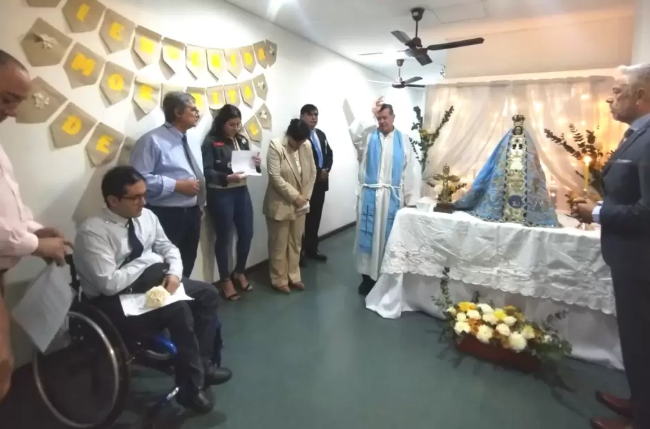 Con profunda devoción participaron de un momento de oración poniendo en las manos de la Virgen María sus intenciones personales, familiares y de esa comunidad laboral. El padre Luis Páez, capellán de la Catedral Basílica y Santuario de la Virgen del Valle, hizo entrega al juez Contreras de un Rosario tallado en madera, gesto que fue agradecido por sus destinatarios.