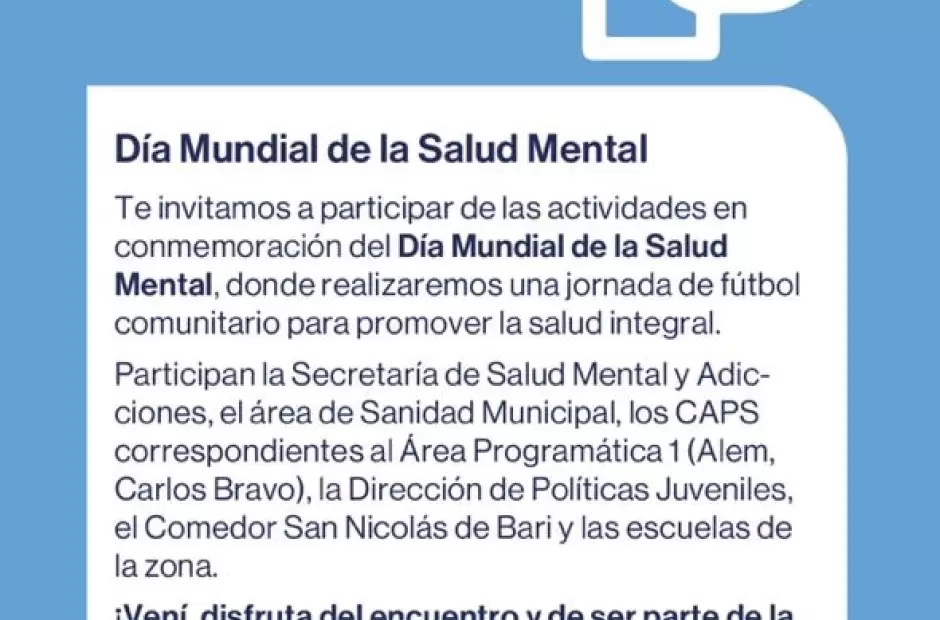 Durante la jornada, se realizará un encuentro de Fútbol Comunitario, espacio de radio abierta y espacio de orientación en Salud Mental a la comunidad.