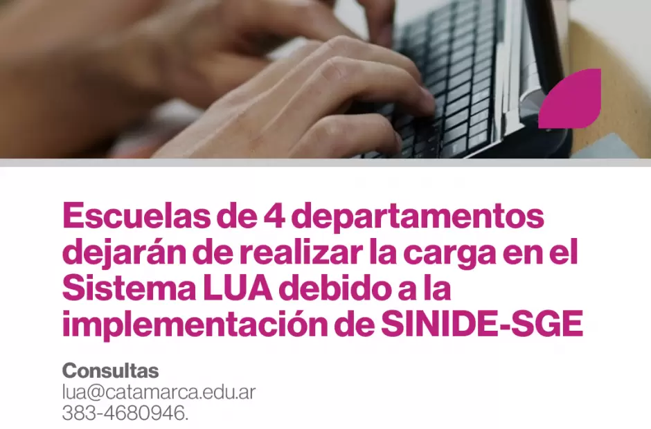 La Dirección Provincial de Formación Profesional de la Información y Evaluación Educativa dependiente de la Secretaría de Planeamiento Educativo comunica que, los responsables de la carga en el Sistema Legajo Único del Alumno 2023 (LUA) de los departamentos Valle Viejo, Capital, Fray Mamerto Esquiú y Capayán dejarán de realizar la carga, debido a la implementación del Sistema SINIDE-SGE en las Instituciones Educativas de estos 4 departamentos.