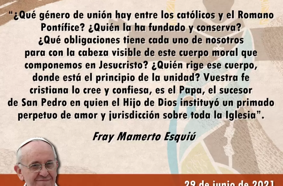 Luego, el pensamiento de Esquiú nos recuerda el sentido de la pertenencia y obediencia que los católicos le debemos al Santo Padre. En este sentido él decía: “¿Qué género de unión hay entre los católicos y el Romano Pontífice? ¿Quién la ha fundado y conserva? ¿Qué obligaciones tiene cada uno de nosotros para con la cabeza visible de este cuerpo moral que componemos en Jesucristo? ¿Quién rige ese cuerpo, donde está el principio de la unidad? Vuestra fe cristiana lo cree y confiesa, es el Papa, el sucesor de San Pedro en quien el Hijo de Dios instituyó un primado perpetuo de amor y jurisdicción sobre toda la Iglesia”.