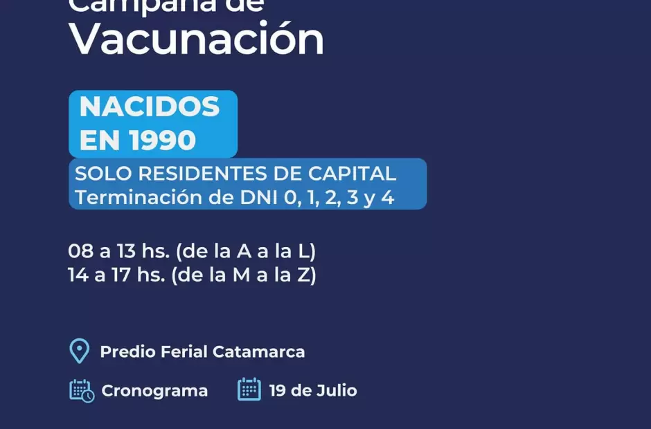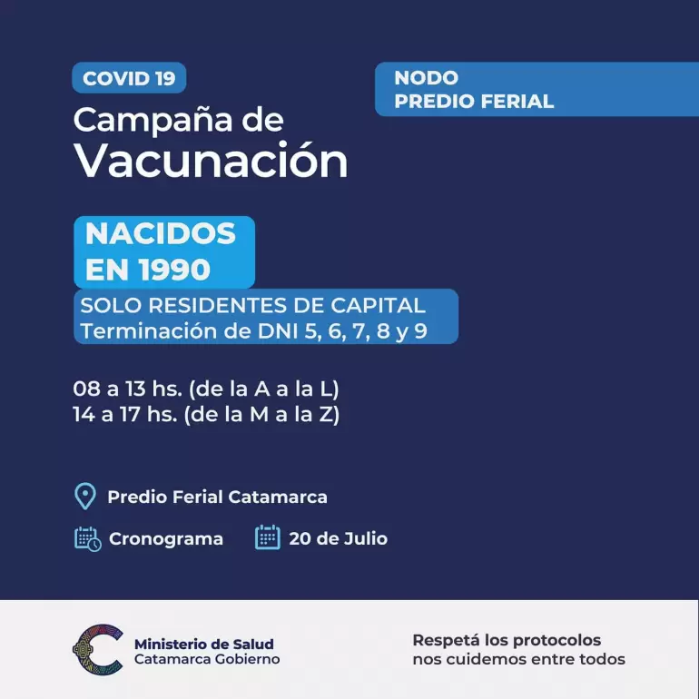 Predio Ferial Catamarca. Clase 1990. 08 a 13 hs. (de la A a la L) y 14 a 17 hs. (de la M a la Z). Terminación de DNI 5, 6, 7, 8 y 9. Solo residentes de Capital.