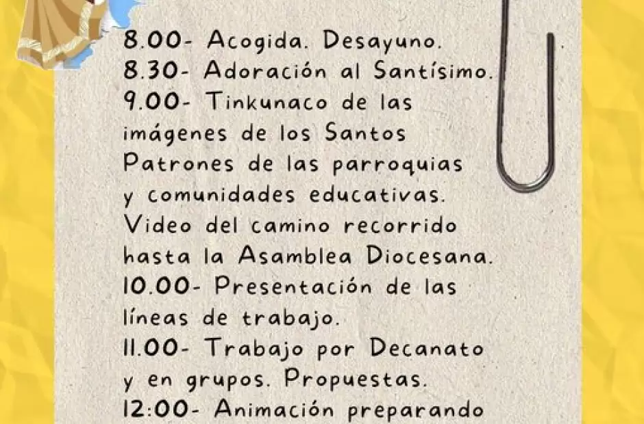 9.00- Tinkunaco de las Imágenes de los Santos Patrones y Patronas de las parroquias y comunidades educativas. Video con imágenes del camino recorrido para llegar a la Asamblea Diocesana.