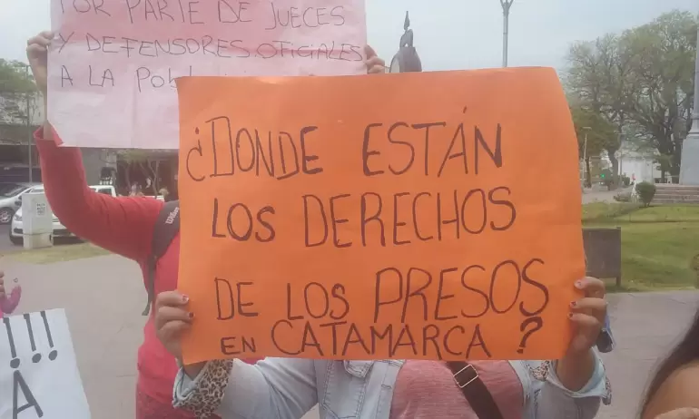 Durante el encuentro, los manifestantes alzaron carteles con escritos como “¿dónde están los derechos de los presos en Catamarca?” o “nos negamos a morir en la cárcel, prisión domiciliaria“, entre otros.
