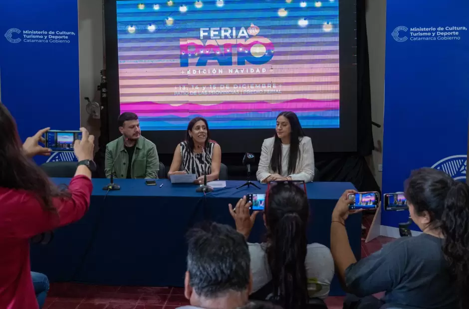 Las secretarias de Gestión Cultural, Laura Maubecín, de Gestión Turística, Evangelina Quarín y el director provincial de Artesanías, Gonzalo Cancino presentaron oficialmente este lunes en el auditorio de la Biblioteca Dr. Julio Herrera la 1º edición de la Feria del Patio, que contará con la presentación de artistas locales de todos los géneros musicales, el cierre del músico cordobés Juan Ingaramo, foodtrucks y el lanzamiento de la temporada de verano de la provincia.