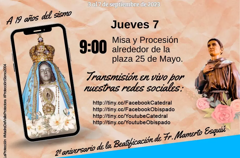 Mientras rige feriado provincial, este jueves se llevarán a cabo las celebraciones en agradeciimiento a la Virgen del Valle por su intervención durante el sismo del 2.004. De esta manera va a culminar la Fiesta de la Protección de Nuestra Madre del Valle al cumplirse 19 años de aquel fenómeno que conmovió a los catamarqueños y que la Iglesia diocesana conmemoró a la par del 2° Aniversario de la Beatificación de Fray Mamerto Esquiú.