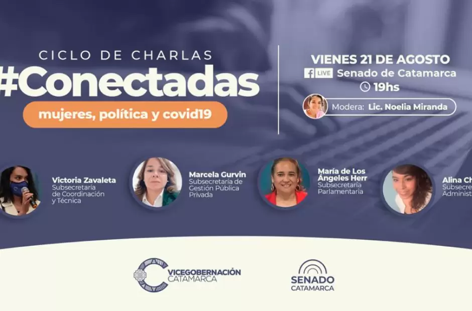 Hoy, desde las 19 a través de la página de Facebook del Senado de Catamarca se realizará una nueva charla virtual del ciclo #Conectadas (mujeres, política y COVID-19), organizado desde el equipo de Vicegobernación de la Provincia con el objeto de generar un espacio de intercambio y escucha junto a mujeres de los más variados ámbitos de actividad en nuestra sociedad.