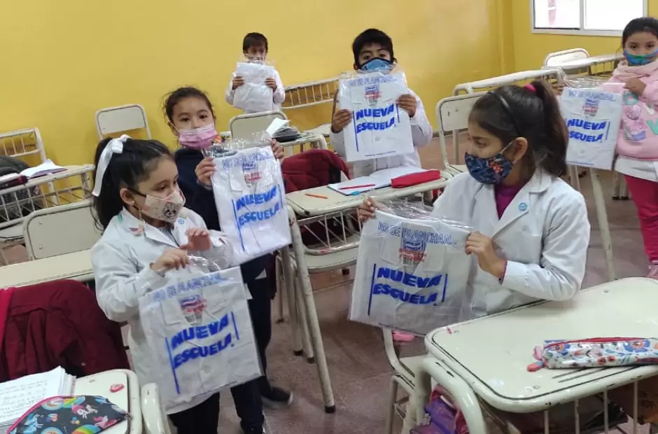 En el marco del regreso a la presencialidad plena de los alumnos y docentes en el renovado edificio escolar, los pequeños de 1° a 6° grado recibieron la nueva indumentaria de manos del equipo de conducción encabezado por su directora, Rosa Juárez y el plantel docente.