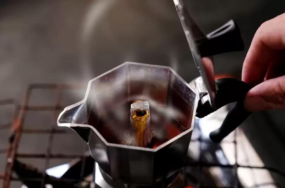 - Vigilar el proceso: Tan pronto como el café empiece a salir, podrías levantar la tapa para observar el color del café que se está extrayendo. Cuando el café que sale se vuelve de color amarillo claro o honey, retirá la cafetera del fuego.