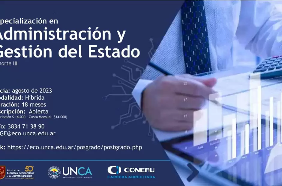 La Facultad de Ciencias Económicas y de Administración de la UNCA informa que se encuentran habilitadas las inscripciones y recepción de la documentación para la carrera de Postgrado “Especialización en Administración y Gestión del Estado- Cohorte lll, que dará inicio a finales de agosto de 2023 en modalidad híbrida.