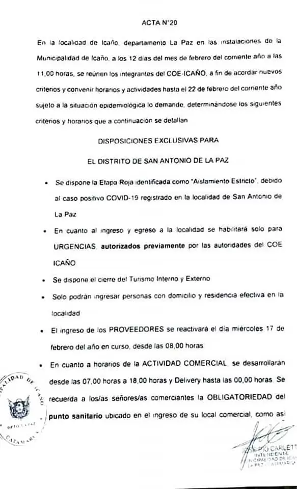 Desde la Municipalidad de Icaño difundieron un comunicado en el cual el COE local dispone la Etapa de Convivencia Roja identificada como "aislamiento estricto" debido al caso positivo de COVID-19 que se registró en San Antonio de La Paz.