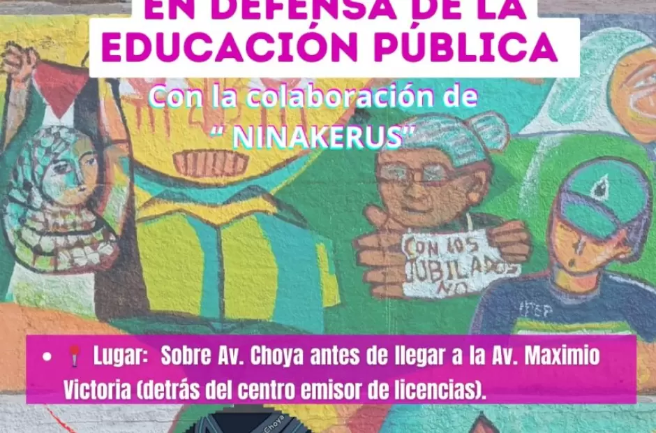 El viernes 13 de diciembre a las 18hs, en Av. Choya (detrás del Centro de Emisión de Licencias de Conducir) se realizará la presentación pública del "Mural en Defensa de la Educación Pública" realizado por la Asamblea Interclaustro Autoconvocada de la Universidad Nacional de Catamarca, en colaboración con la muralista independiente NINAKERUS. Invitamos a la comunidad en general a participar de este evento significativo en la lucha por los derechos educativos y laborales.