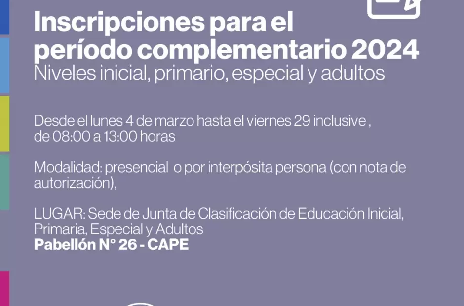 El Ministerio de Educación a través de la Junta de Clasificación de Educación Inicial, Primaria, Especial y Adultos, informa que las inscripciones para el período complementario 2024, se llevarán a cabo desde el lunes 4 de marzo hasta el viernes 29 inclusive, bajo la modalidad presencial o por interpósita persona (con nota de autorización), en el horario de 08:00 a 13:00 horas, en el pabellón N° 26 del CAPE.