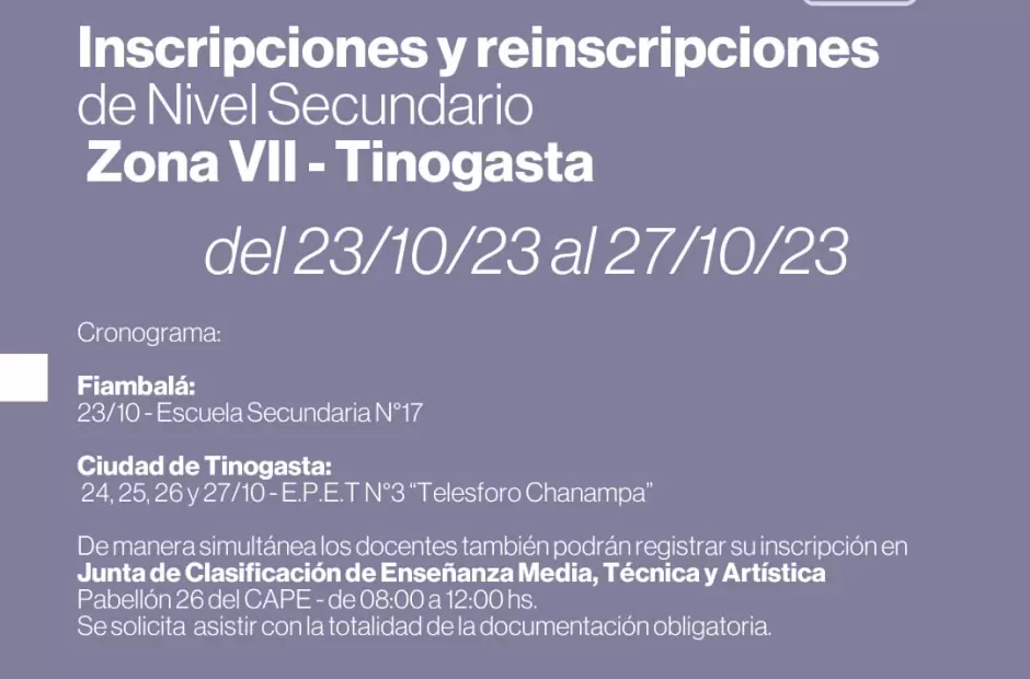El Ministerio de Educación y la Junta de Clasificación de Enseñanza Media, Técnica y Artística, informa a los docentes de Nivel Secundario que las INSCRIPCIONES Y REINSCRIPCIONES para interinatos y suplencias- para ZONA VII: TINOGASTA - PERIODO 2024 se llevarán a cabo desde el día 23 al 27 de octubre de 2023 inclusive